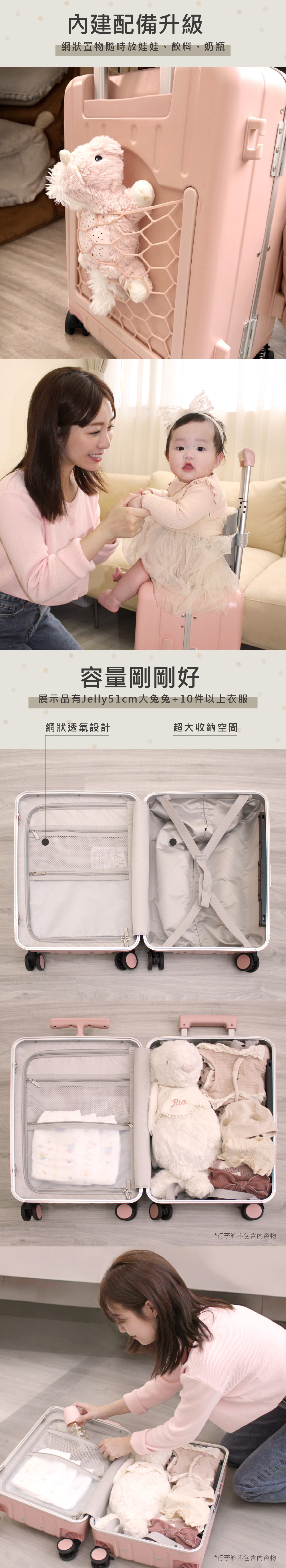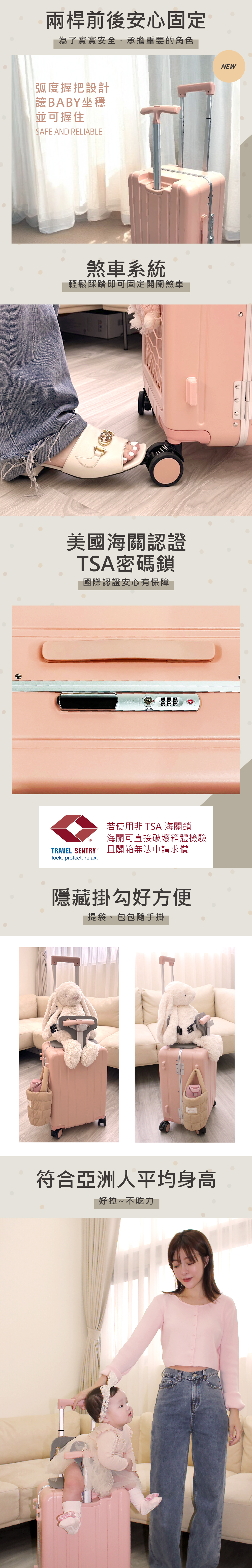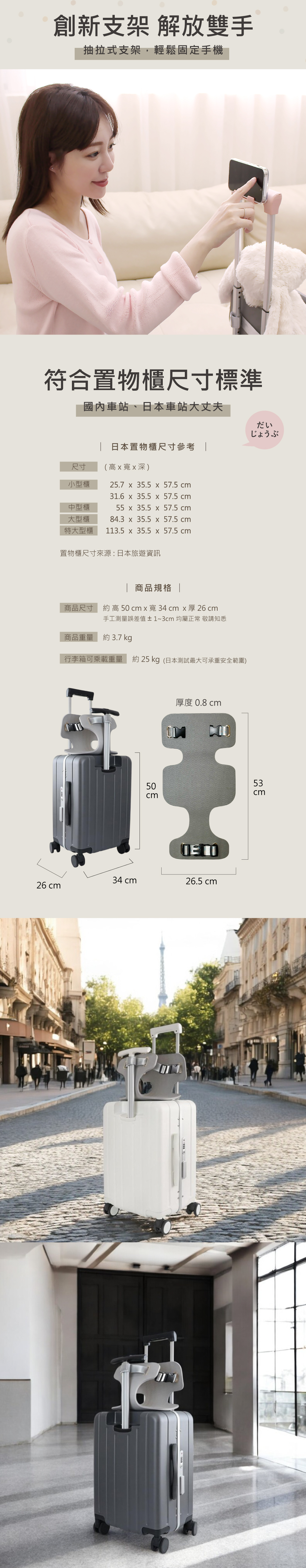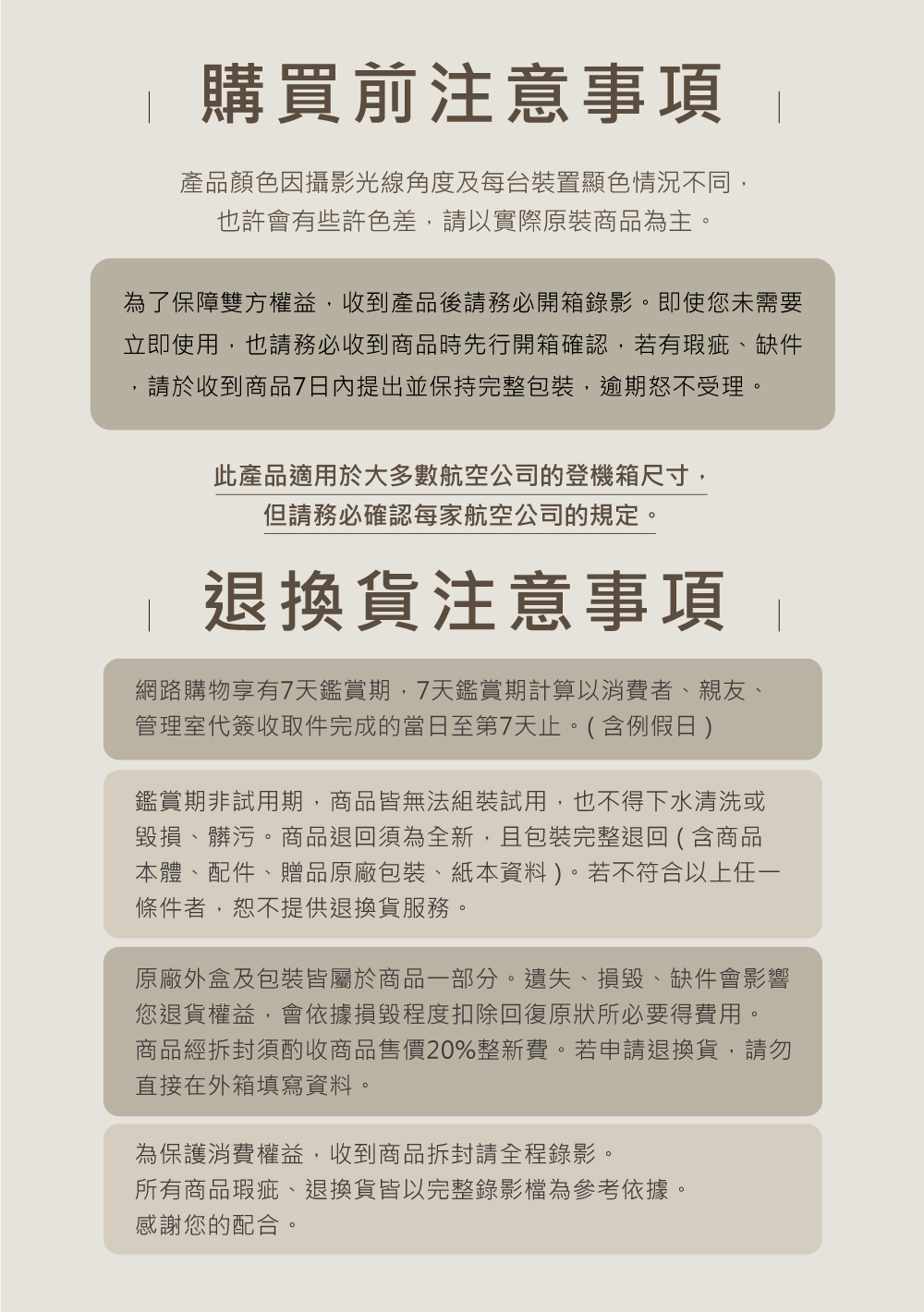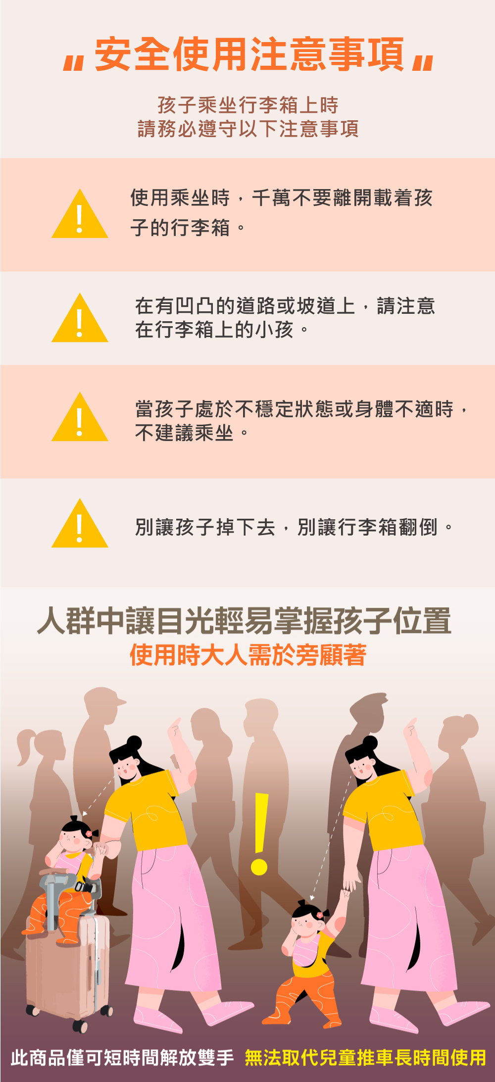 1. 將行李平均分攤在行李箱兩側,重物放在底部,保持四輪平行平推為最佳使用方式。