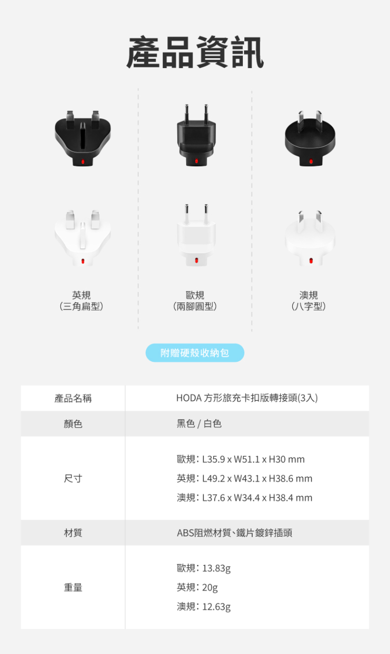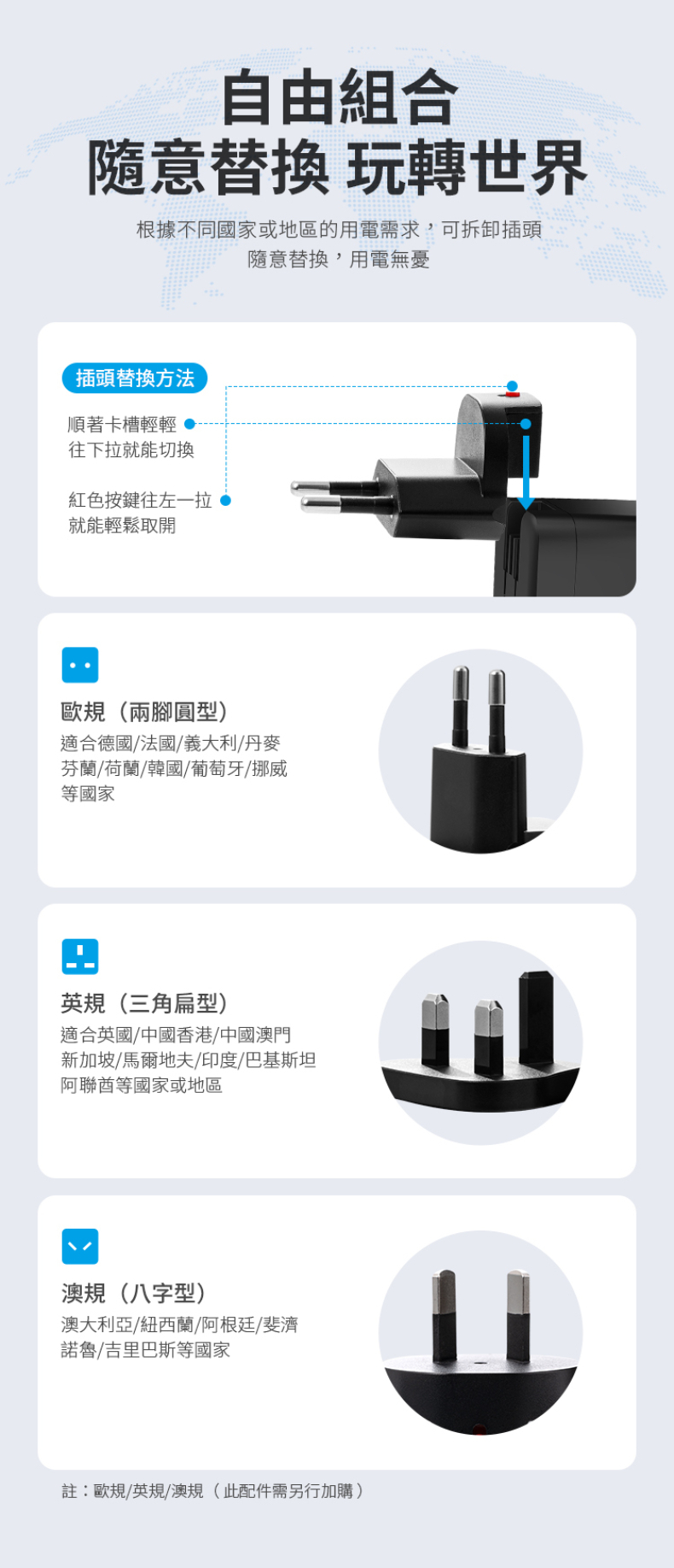 🔸一次擁有歐、英、澳三種規格插頭,輕鬆應對全球各國電壓