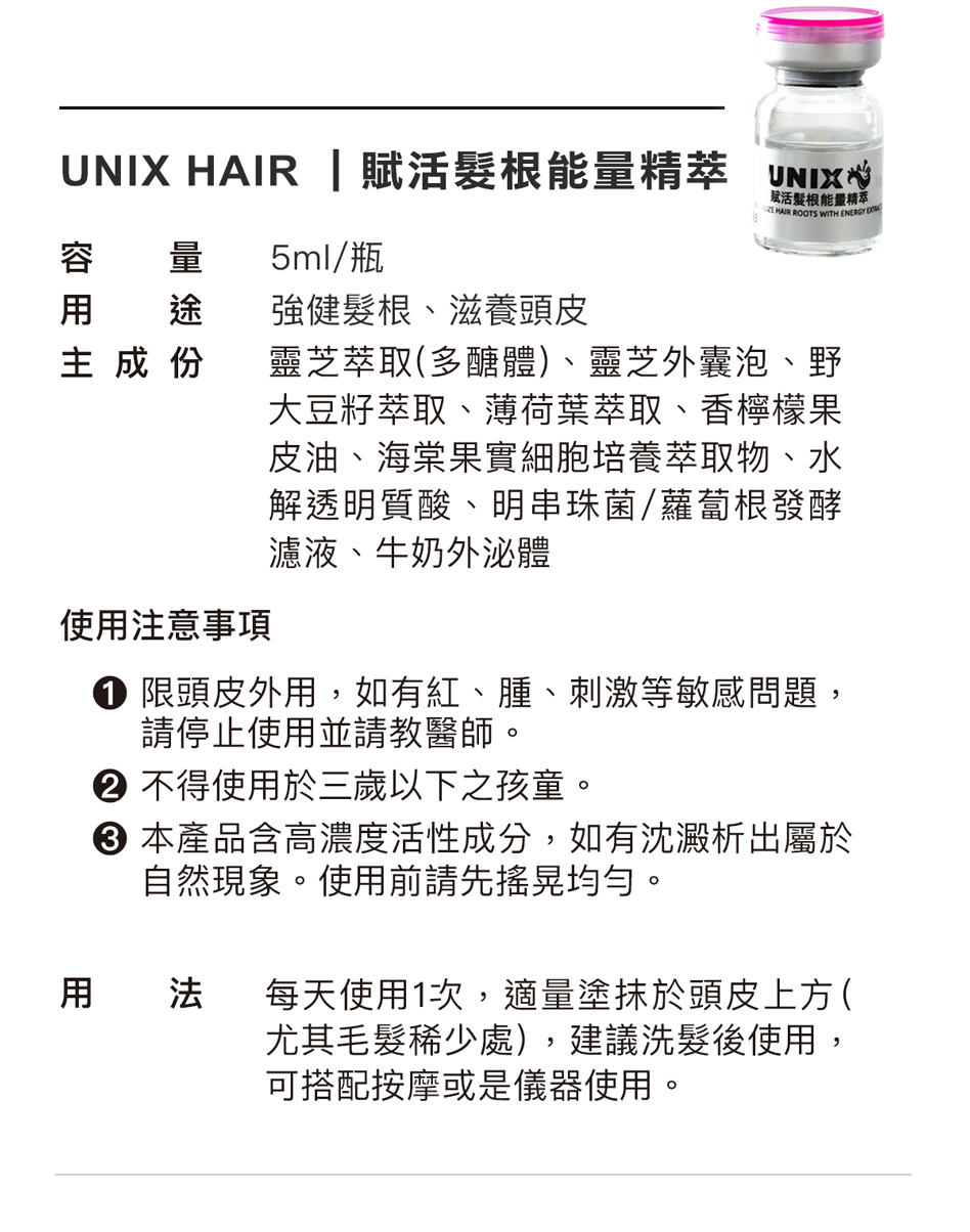 商品用法:每天使用1次,適量塗抹於頭皮上方(尤其毛髮稀少處),建議洗髮後使用,可搭配按摩或是儀器使用。