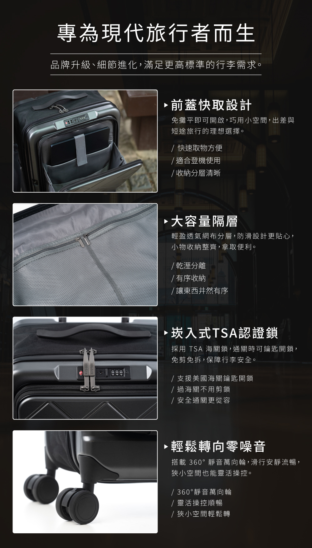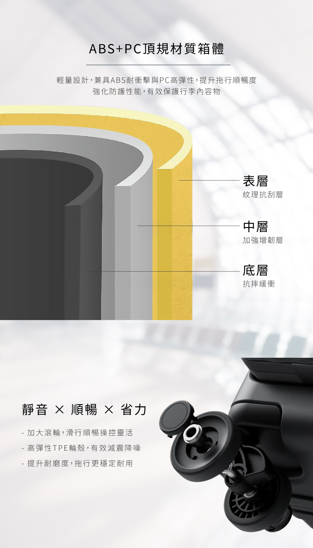 ★ 四輪萬向滑輪 | 滑行平穩、轉向靈活,適合城市移動、地鐵、機場使用。